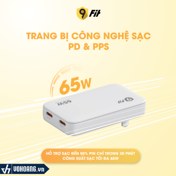 Sạc 9FIT Slim PD 65W 2C GaN mang đến khả năng sạc nhanh vượt trội nhờ công suất tối đa 65W, giúp rút ngắn thời gian chờ đợi, đảm bảo thiết bị luôn sẵn sàng hoạt động. Với công nghệ Power Delivery (PD) & PPS, bộ sạc có thể sạc 50% pin chỉ trong 30 phút, giúp bạn tiết kiệm thời gian và duy trì năng lượng cho cả ngày dài.