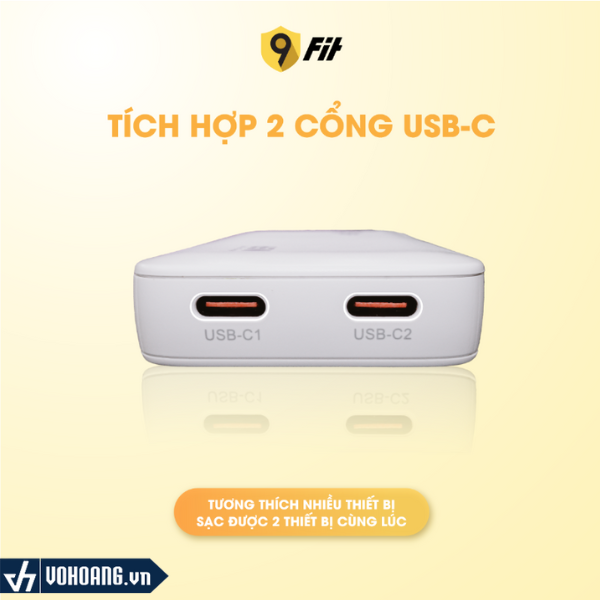 Sạc 9FIT Slim PD 65W 2C GaN được trang bị hai cổng USB-C, cho phép sạc đồng thời hai thiết bị mà vẫn đảm bảo tốc độ sạc nhanh và ổn định. Điều này giúp người dùng tối ưu thời gian sạc, đặc biệt tiện lợi khi cần nạp năng lượng cho cả điện thoại và laptop hoặc hai thiết bị di động cùng lúc.