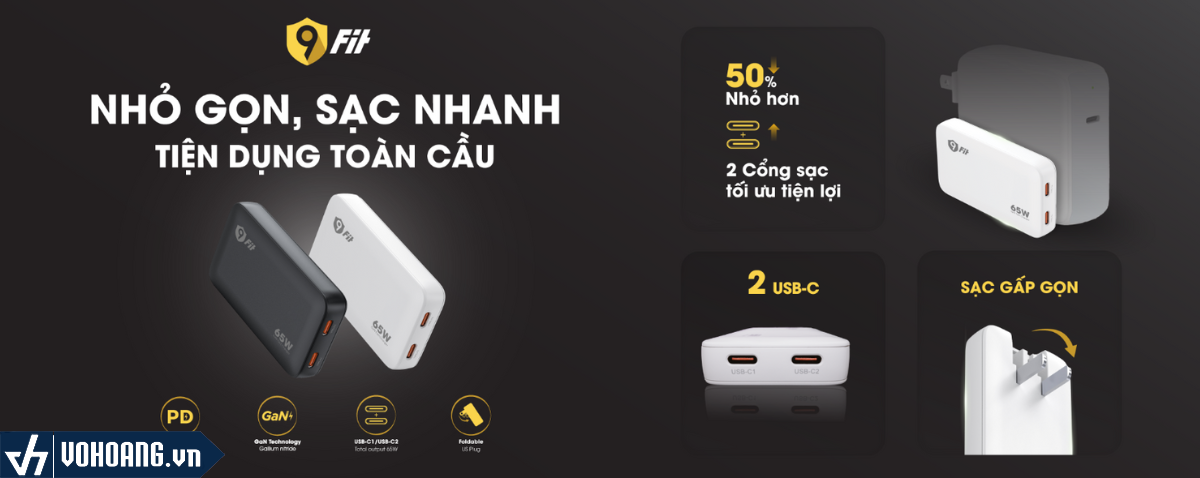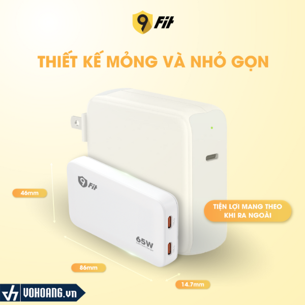 Củ sạc 9Fit Slim PD 65W 2C GaN có thiết kế nhỏ gọn, phích cắm gập tiện lợi, hỗ trợ hai cổng USB-C với công suất tối đa 65W, sạc nhanh 50% pin trong 30 phút. Công nghệ GaN nâng cao hiệu suất, hạn chế tỏa nhiệt. Mẫu sạc nhanh này còn chân sạc gấp gọn để tiện lợi trong việc di chuyển.