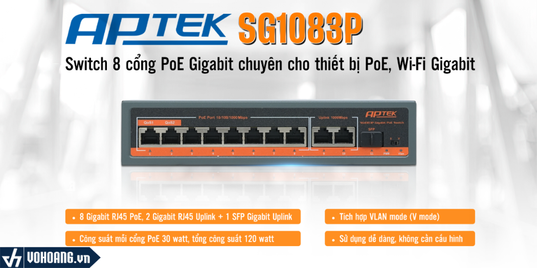 Bên cạnh 8 cổng Gigabit RJ45 chuẩn PoE, APTEK SG1083P có thêm 2 cổng Gigabit RJ45 Uplink và 1 cổng SFP Gigabit Uplink.