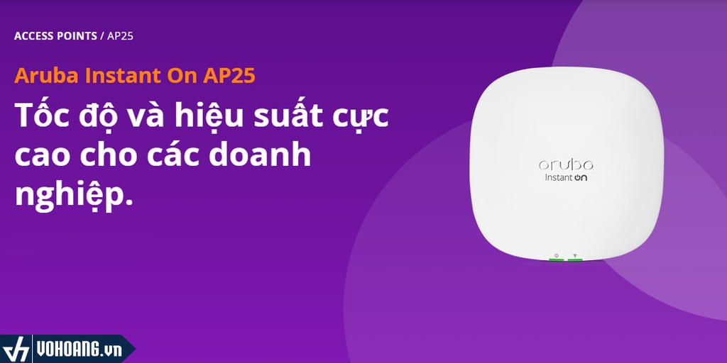 Aruba Instant On AP25, một điểm truy cập Wi-Fi 6 4x4, được thiết kế để đáp ứng nhu cầu tăng số lượng thiết bị được kết nối nhưng vẫn đảm bảo mang lại hiệu suất, phạm vi phủ sóng và tốc độ vượt trội với mức giá cạnh tranh, AP25 là điểm truy cập hoàn hảo cho doanh nghiệp nhỏ và đang phát triển.