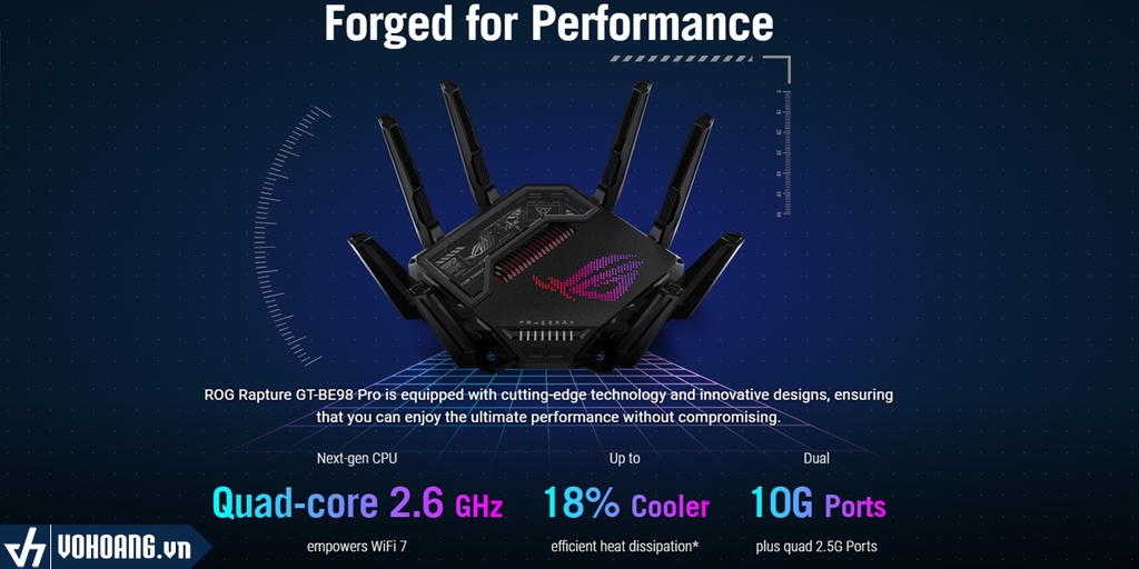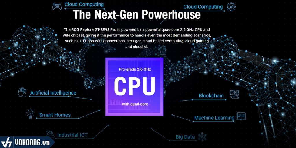 ROG Rapture GT-BE98 Pro được trang bị CPU lõi tứ 2,6 GHz mạnh mẽ và chipset WiFi, mang lại hiệu năng xử lý ngay cả những tình huống đòi hỏi khắt khe nhất, chẳng hạn như kết nối WiFi 10 Gbps, điện toán đám mây thế hệ tiếp theo, chơi game trên đám mây và AI đám mây.