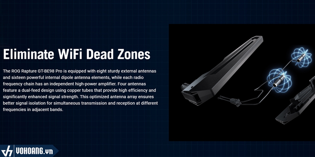 Loại bỏ vùng chết WiFi: ROG Rapture GT-BE98 Pro được trang bị tám ăng-ten ngoài chắc chắn và mười sáu thành phần ăng-ten lưỡng cực bên trong mạnh mẽ, trong khi mỗi chuỗi tần số vô tuyến đều có bộ khuếch đại công suất cao độc lập. Bốn ăng-ten được thiết kế với hai nguồn cấp dữ liệu sử dụng ống đồng, mang lại hiệu suất cao và cường độ tín hiệu được cải thiện đáng kể. Mảng ăng-ten được tối ưu hóa này đảm bảo khả năng cách ly tín hiệu tốt hơn cho việc truyền và nhận đồng thời ở các tần số khác nhau trong các băng tần liền kề.