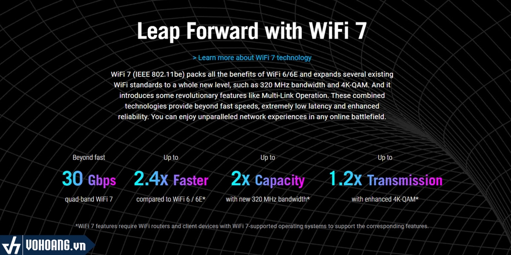 WiFi 7 (IEEE 802.11be) tích hợp tất cả các lợi ích của WiFi 6/6E và mở rộng một số chuẩn WiFi hiện có lên một tầm cao mới, chẳng hạn như băng thông 320 MHz và 4K-QAM. WiFi 7 cũng giới thiệu một số tính năng đột phá như Vận hành Đa Liên kết. Những công nghệ kết hợp này mang đến tốc độ vượt trội, độ trễ cực thấp và độ tin cậy được nâng cao. Bạn có thể tận hưởng trải nghiệm mạng tuyệt vời trên mọi chiến trường trực tuyến.