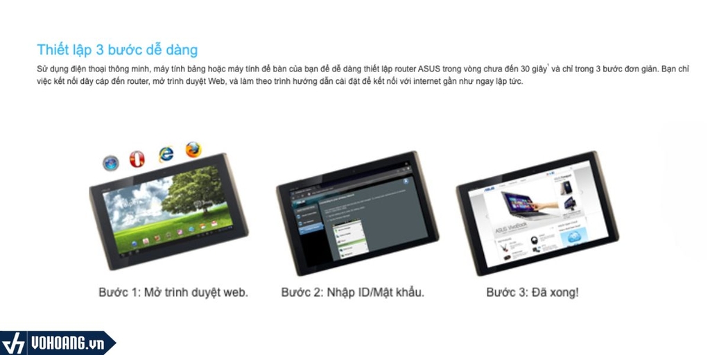 Sử dụng điện thoại thông minh, máy tính bảng hoặc máy tính để bàn của bạn để dễ dàng thiết lập router ASUS trong vòng chưa đến 30 giây¹ và chỉ trong 3 bước đơn giản. Bạn chỉ việc kết nối dây cáp đến router, mở trình duyệt Web, và làm theo trình hướng dẫn cài đặt để kết nối với internet gần như ngay lập tức.
