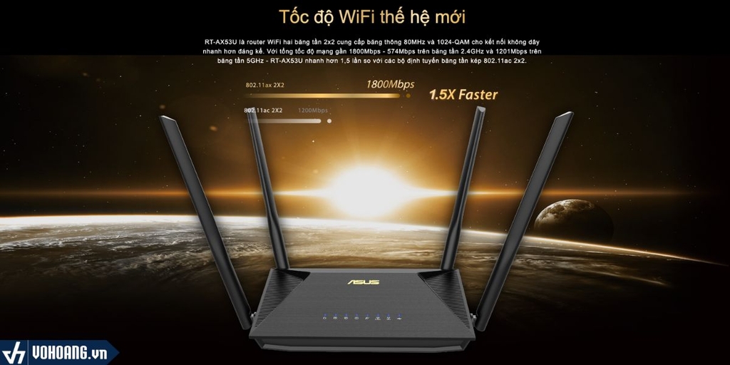 RT-AX53U là router WiFi hai băng tần 2x2 cung cấp băng thông 80MHz và 1024-QAM cho kết nối không dây nhanh hơn đáng kể.