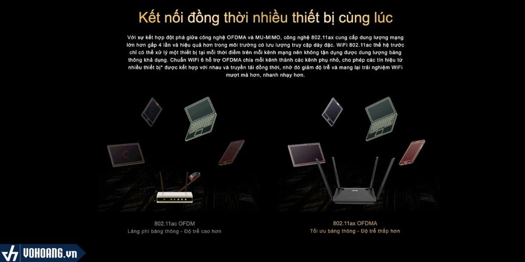 Với sự kết hợp đột phá giữa công nghệ OFDMA và MU-MIMO, công nghệ 802.11ax cung cấp dung lượng mạng lớn hơn gấp 4 lần và hiệu quả hơn trong môi trường có lưu lượng truy cập dày đặc. WiFi 802.11ac thế hệ trước chỉ có thể xử lý một thiết bị tại mỗi thời điểm trên mỗi kênh mạng nên không tận dụng được dung lượng băng thông khả dụng. Chuẩn WiFi 6 hỗ trợ OFDMA chia mỗi kênh thành các kênh phụ nhỏ, cho phép các tín hiệu từ nhiều thiết bị được kết hợp với nhau và truyền tải đồng thời, nhờ đó giảm độ trễ và mang lại trải nghiệm WiFi mượt mà hơn, nhanh nhạy hơn.