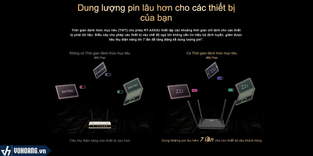 Thời gian đánh thức mục tiêu (TWT) cho phép RT-AX53U thiết lập các khoảng thời gian chỉ định cho các thiết bị phát dữ liệu. Điều này cho phép các thiết bị vào chế độ ngủ khi không cần tín hiệu bộ định tuyến, giảm được tiêu thụ điện năng tới 7 lần để tăng đáng kể dung lượng pin.
