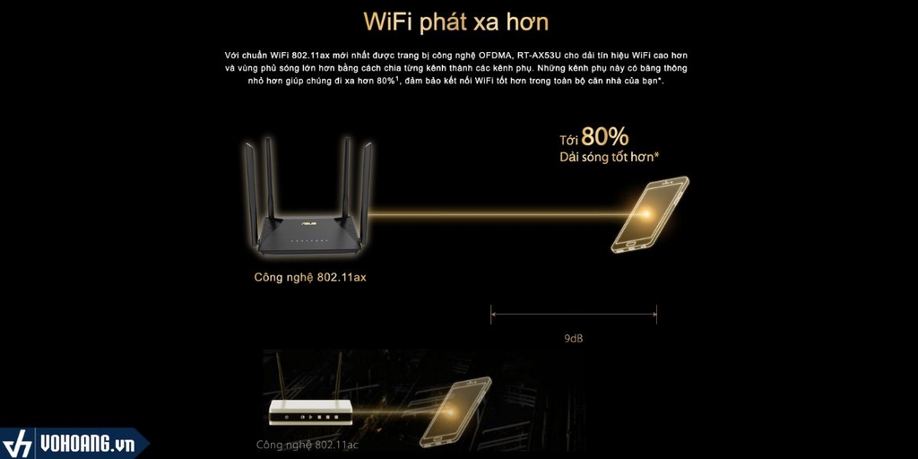 Với chuẩn WiFi 802.11ax mới nhất được trang bị công nghệ OFDMA, RT-AX53U cho dải tín hiệu WiFi cao hơn và vùng phủ sóng lớn hơn bằng cách chia từng kênh thành các kênh phụ. Những kênh phụ này có băng thông nhỏ hơn giúp chúng đi xa hơn 80%, đảm bảo kết nối WiFi tốt hơn trong toàn bộ căn nhà của bạn.