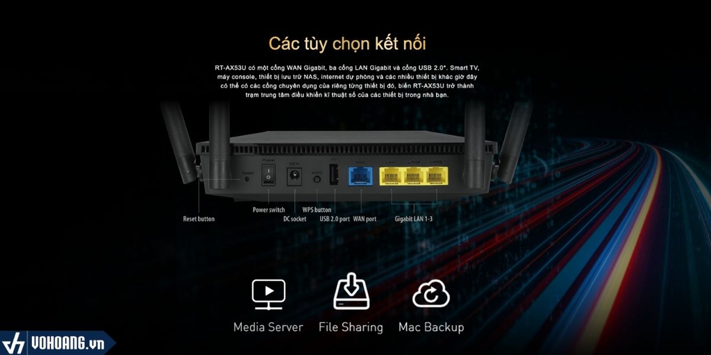 Router wifi 6 giá rẻ RT-AX53U có một cổng WAN Gigabit, ba cổng LAN Gigabit và cổng USB 2.0*. Smart TV, máy console, thiết bị lưu trữ NAS, internet dự phòng và các nhiều thiết bị khác giờ đây có thể có các cổng chuyên dụng của riêng từng thiết bị đó, biến RT-AX53U trở thành trạm trung tâm điều khiển kĩ thuật số của các thiết bị trong nhà bạn.