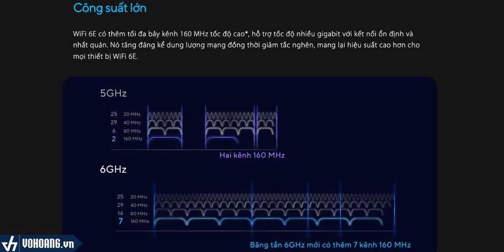 WiFi 6E có thêm tối đa bảy kênh 160 MHz tốc độ cao, hỗ trợ tốc độ nhiều gigabit với kết nối ổn định và nhất quán. Nó tăng đáng kể dung lượng mạng đồng thời giảm tắc nghẽn, mang lại hiệu suất cao hơn cho mọi thiết bị WiFi 6E.