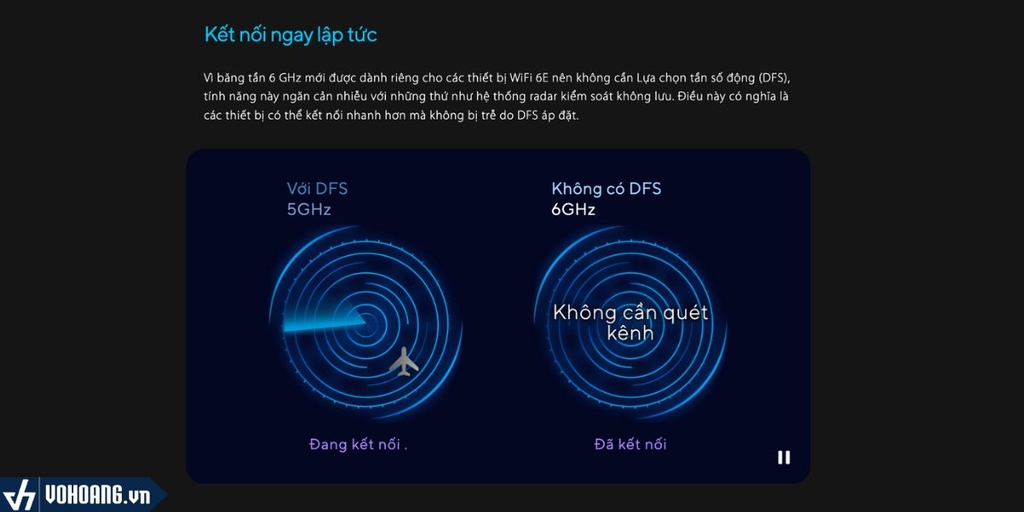 Vì băng tần 6 GHz mới được dành riêng cho các thiết bị WiFi 6E nên không cần Lựa chọn tần số động (DFS), tính năng này ngăn cản nhiễu với những thứ như hệ thống radar kiểm soát không lưu. Điều này có nghĩa là các thiết bị có thể kết nối nhanh hơn mà không bị trễ do DFS áp đặt.