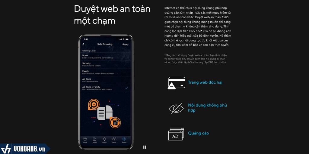 Internet có thể chứa nội dung không phù hợp, quảng cáo xâm nhập hoặc các mối nguy hiểm và rủi ro về an toàn khác. Duyệt web an toàn ASUS giúp chặn nội dung không mong muốn chỉ bằng một cú chạm -- không cần thêm ứng dụng. Tính năng lọc dựa trên DNS nhẹ của nó sẽ không ảnh hưởng đến hiệu suất của bộ định tuyến. Nó thậm chí có thể lọc nội dung tục tĩu khỏi kết quả của công cụ tìm kiếm để bảo vệ con bạn trực tuyến.