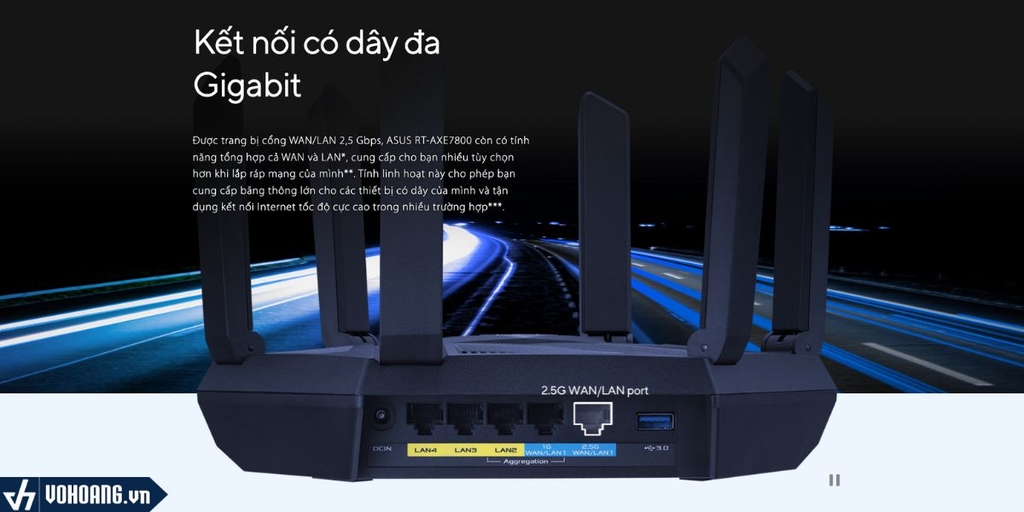 Được trang bị cổng WAN/LAN 2,5 Gbps, ASUS RT-AXE7800 còn có tính năng tổng hợp cả WAN và LAN*, cung cấp cho bạn nhiều tùy chọn hơn khi lắp ráp mạng của mình**. Tính linh hoạt này cho phép bạn cung cấp băng thông lớn cho các thiết bị có dây của mình và tận dụng kết nối Internet tốc độ cực cao trong nhiều trường hợp.