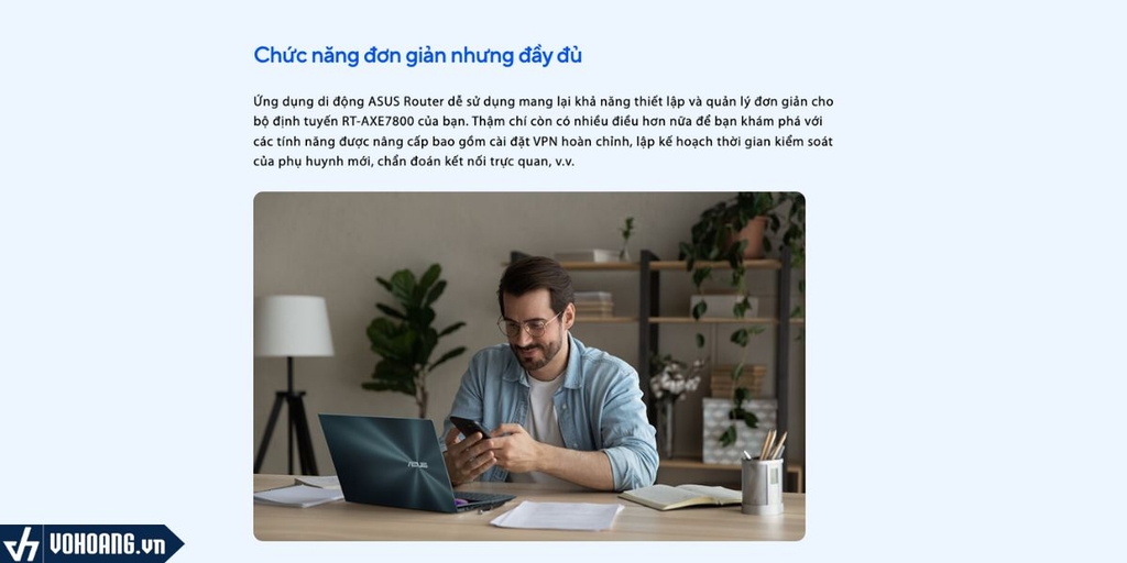 Ứng dụng di động ASUS Router dễ sử dụng mang lại khả năng thiết lập và quản lý đơn giản cho bộ định tuyến RT-AXE7800 của bạn. Thậm chí còn có nhiều điều hơn nữa để bạn khám phá với các tính năng được nâng cấp bao gồm cài đặt VPN hoàn chỉnh, lập kế hoạch thời gian kiểm soát của phụ huynh mới, chẩn đoán kết nối trực quan, v.v.
