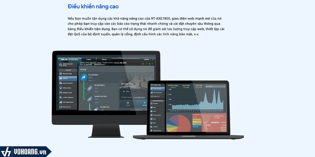 Nếu bạn muốn tận dụng các khả năng nâng cao của RT-AXE7800, giao diện web mạnh mẽ của nó cho phép bạn truy cập vào các báo cáo trạng thái nhanh chóng và cài đặt chuyên sâu thông qua bảng điều khiển tiện dụng. Bạn có thể sử dụng nó để giám sát lưu lượng truy cập web, thiết lập cài đặt QoS của bộ định tuyến, quản lý cổng, định cấu hình các tính năng bảo mật, v.v.