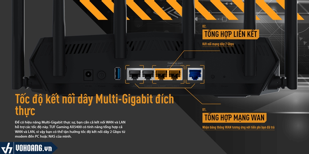 Để có hiệu năng Multi-Gigabit thực sự, bạn cần cả kết nối WAN và LAN hỗ trợ các tốc độ này. TUF Gaming AX5400 có tính năng tổng hợp cả WAN và LAN, vì vậy bạn có thể tận hưởng tốc độ kết nối dây 2 Gbps từ modem đến PC hoặc NAS của mình.