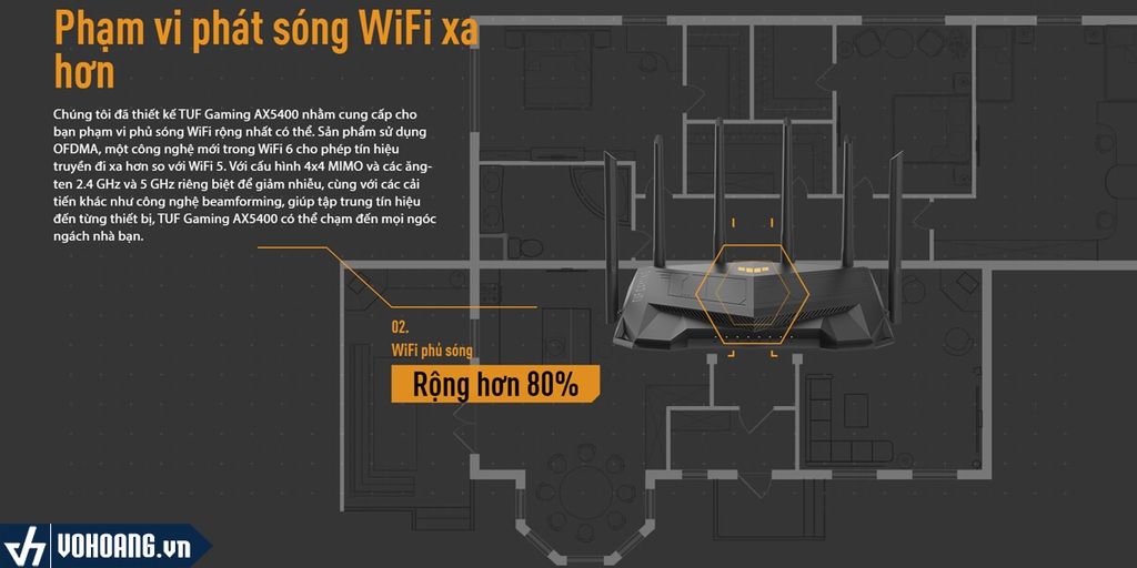 Chúng tôi đã thiết kế TUF Gaming AX5400 nhằm cung cấp cho bạn phạm vi phủ sóng WiFi rộng nhất có thể. Sản phẩm sử dụng OFDMA, một công nghệ mới trong WiFi 6 cho phép tín hiệu truyền đi xa hơn so với WiFi 5. Với cấu hình 4x4 MIMO và các ăng-ten 2.4 GHz và 5 GHz riêng biệt để giảm nhiễu, cùng với các cải tiến khác như công nghệ beamforming, giúp tập trung tín hiệu đến từng thiết bị, TUF Gaming AX5400 có thể chạm đến mọi ngóc ngách nhà bạn.