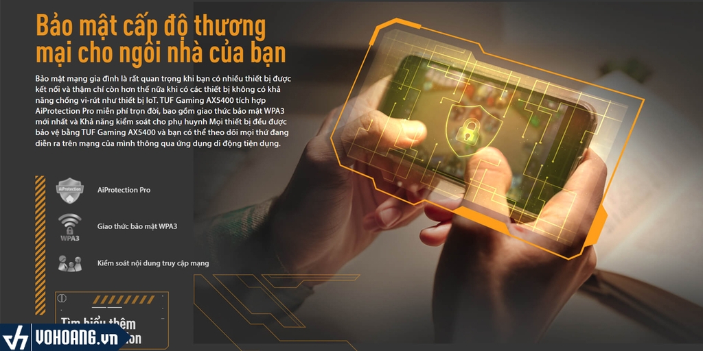 Bảo mật mạng gia đình là rất quan trọng khi bạn có nhiều thiết bị được kết nối và thậm chí còn hơn thế nữa khi có các thiết bị không có khả năng chống vi-rút như thiết bị IoT. TUF Gaming AX5400 tích hợp AiProtection Pro miễn phí trọn đời, bao gồm giao thức bảo mật WPA3 mới nhất và Khả năng kiểm soát cho phụ huynh Mọi thiết bị đều được bảo vệ bằng TUF Gaming AX5400 và bạn có thể theo dõi mọi thứ đang diễn ra trên mạng của mình thông qua ứng dụng di động tiện dụng.