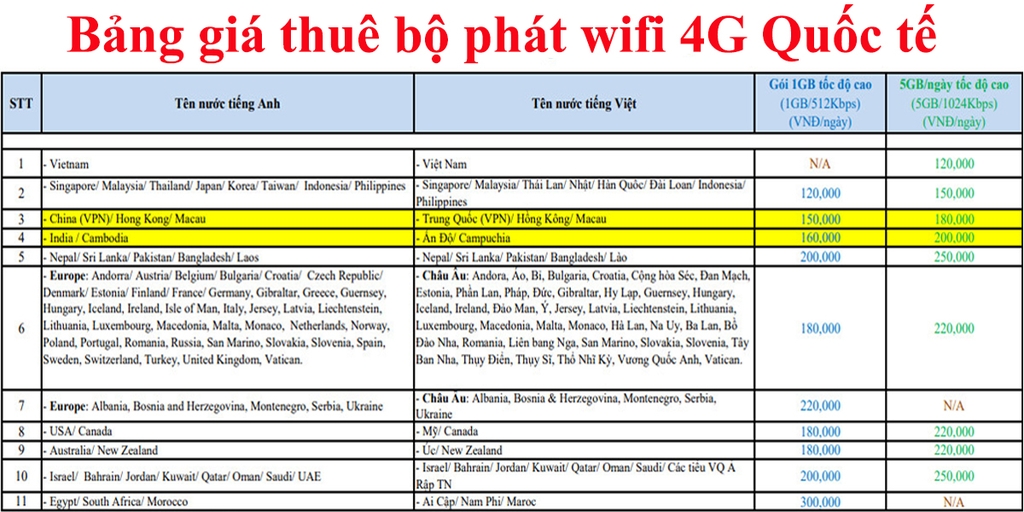 Bảng Giá Cho Thuê Bộ Phát WiFi 4G Du Lịch Các Nước Trên Thế Giới - Đơn Giá Theo Ngày