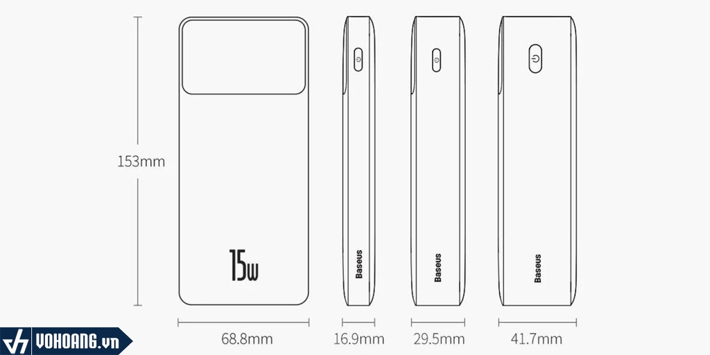 Baseus Bipow được thiết kế theo dạng khối vuông với những góc bo tròn cho cảm giác cầm nắm tốt, với 2 màu cơ bản trắng và đen được tinh chỉnh lớp sơn nhám không để lại vết mồ hôi vân tay tăng trải nghiệm người dùng. Ngay chính giữa là một màn hình LED nhỏ hiện thị số phần trăm pin còn lại, cho phép người sử dụng dễ dàng theo dõi dung lượng pin chính xác nhất.