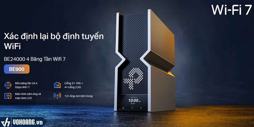 TP-Link Archer BE900 - chuẩn BE24000 là router Wi-Fi 7 hỗ trợ 4 băng tần với tốc độ lên đến 24.4Gbps. Archer BE900 có hai cổng WAN/LAN 10G, bao gồm một cổng RJ45 và một cổng kết hợp SFP+ Fiber/RJ45 Ethernet. Archer BE900 còn trang bị màn hình cảm ứng, giúp bạn nhận biết được thời tiết, thời gian và biểu tượng cảm xúc. Với 12 ăng-ten ngầm, Archer BE900 mang lại phạm vi phủ sóng rộng lớn.