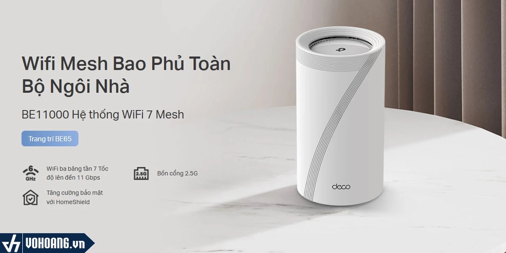 TP-Link Deco BE65, chuẩn BE11000, hỗ trợ 3 băng tần: 6Ghz (802.11be), 5Ghz (802.11be), 2.4Ghz (802.11ax) với tổng băng thông 1.2Gbps. Có 4 cổng 2.5 Gbps, công nghệ 2x2 MLO, OFDMA, 6 Streams, QoS. Tích hợp 4 ăng-ten ngầm, công nghệ AI-Driven Mesh cho sóng wifi phủ toàn nhà.