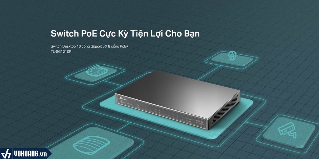 TP-Link TL-SG1210P - thiết bị chia mạng có kèm cấp nguồn PoE/PoE+ theo tiêu chuẩn IEEE 802.3af/at dùng được cho tất các thiết bị cấp nguồn qua dây mạng LAN như: Access Point (điểm truy cập mạng), camera, điện thoại IP..