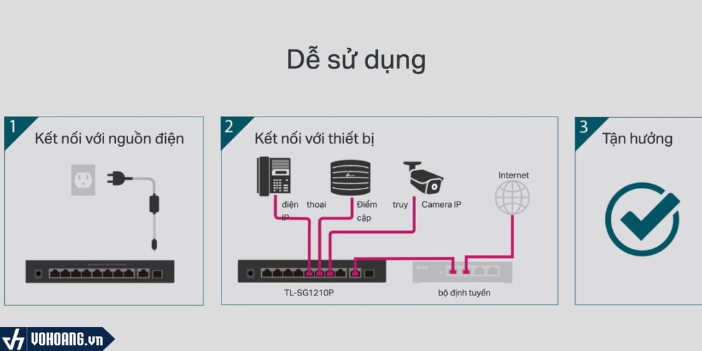 TP-Link TL-SG1210P cắm vào là có thể sử dụng được ngay, bạn không cần phải cài đặt gì nhờ hoạt động theo giao thức Active thiết bị sẽ gửi yêu cầu cấp nguồn đến thiết bị nếu đúng tiêu chuẩn thì sẽ kết nối còn không sẽ từ chối đảm bảo an toàn khi sử dụng.