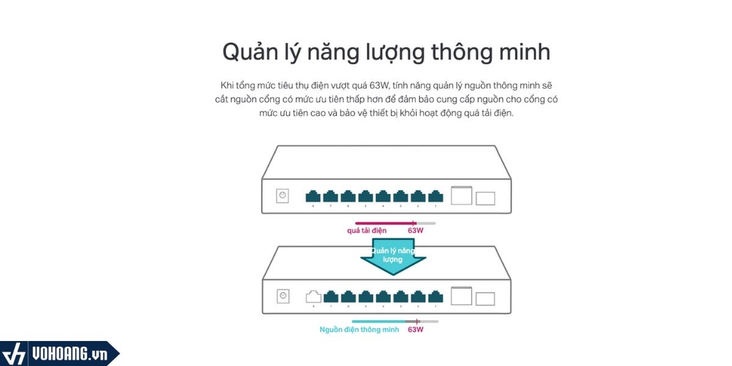 Khi tổng mức tiêu thụ điện vượt quá 63W, quản lý nguồn thông minh sẽ cắt nguồn cổng ưu tiên thấp hơn để đảm bảo cung cấp nguồn cho cổng ưu tiên cao và bảo vệ thiết bị khỏi hoạt động quá tải điện. Nó cũng tự động phát hiện và cung cấp năng lượng cần thiết cho các thiết bị PoE của bạn đồng thời bảo vệ thiết bị PoE và không phải PoE của bạn không bị hư hỏng.