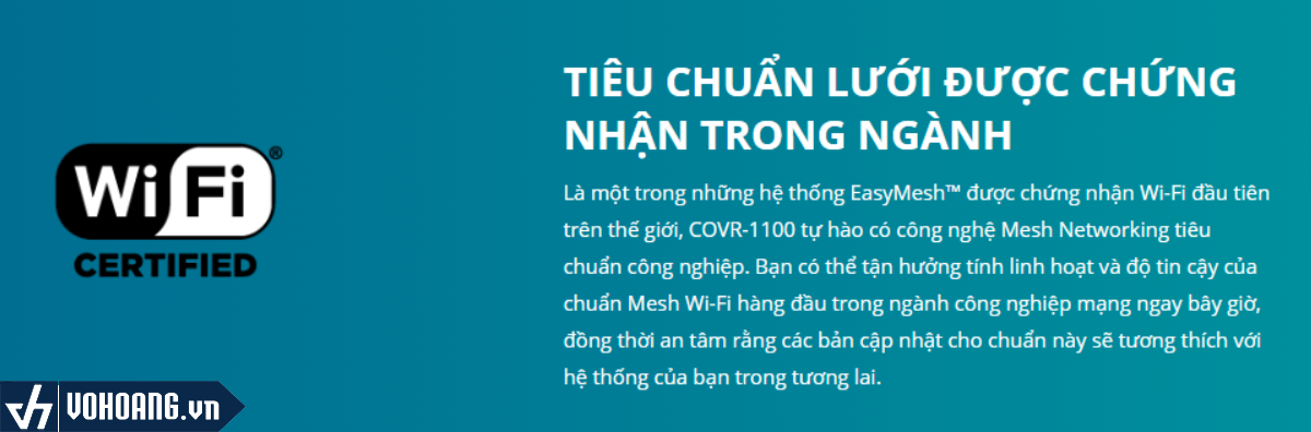 Là một trong những hệ thống EasyMesh™ được chứng nhận đầu tiên trên thế giới, COVR-1100 tự hào có công nghệ Mesh Networking tiêu chuẩn công nghiệp. Bạn có thể tận hưởng tính linh hoạt và độ tin cậy của chuẩn Mesh Wi-Fi hàng đầu trong ngành công nghiệp mạng ngay bây giờ, đồng thời an tâm rằng các bản cập nhật cho chuẩn này sẽ tương thích với hệ thống của bạn trong tương lai.