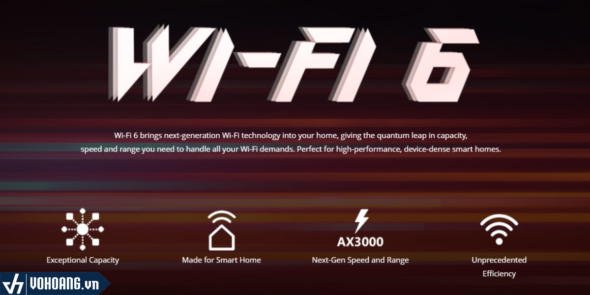 Wi-Fi 6 mang công nghệ Wi-Fi thế hệ tiếp theo vào ngôi nhà của bạn, mang đến bước nhảy vọt về dung lượng, tốc độ và phạm vi mà bạn cần để xử lý mọi nhu cầu Wi-Fi của mình. Hoàn hảo cho những ngôi nhà thông minh có hiệu suất cao, nhiều thiết bị.