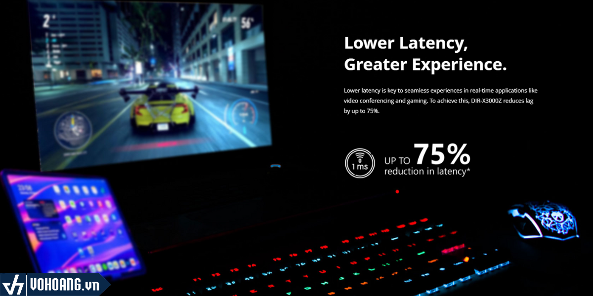 Độ trễ thấp hơn là chìa khóa cho trải nghiệm liền mạch trong các ứng dụng thời gian thực như hội nghị truyền hình và chơi game. Để đạt được điều này, DIR-X3000Z giảm độ trễ tới 75%.