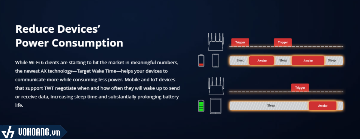 Trong khi các máy khách Wi-Fi 6 đang bắt đầu xuất hiện trên thị trường với số lượng đáng kể, công nghệ AX mới nhất—Target Wake Time—giúp các thiết bị của bạn giao tiếp nhiều hơn trong khi tiêu thụ ít điện năng hơn. Các thiết bị di động và IoT hỗ trợ TWT sẽ thương lượng về thời điểm và tần suất chúng sẽ thức dậy để gửi hoặc nhận dữ liệu, tăng thời gian ngủ và kéo dài đáng kể tuổi thọ pin.