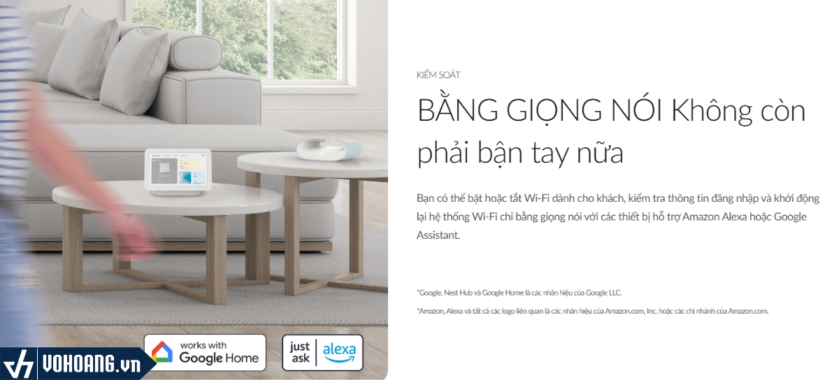 Bạn có thể bật hoặc tắt Wi-Fi dành cho khách, kiểm tra thông tin đăng nhập và khởi động lại hệ thống Wi-Fi chỉ bằng giọng nói với các thiết bị hỗ trợ Amazon Alexa hoặc Google Assistant.