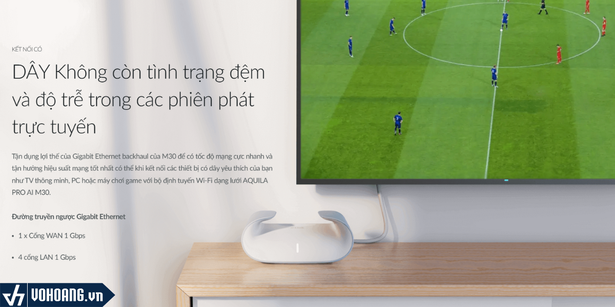 Tận dụng lợi thế của Gigabit Ethernet backhaul của M30 để có tốc độ mạng cực nhanh và tận hưởng hiệu suất mạng tốt nhất có thể khi kết nối các thiết bị có dây yêu thích của bạn như TV thông minh, PC hoặc máy chơi game với bộ định tuyến Wi-Fi dạng lưới AQUILA PRO AI M30.