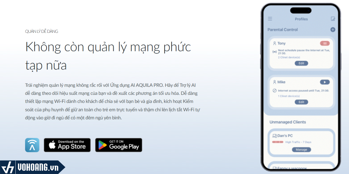 Trải nghiệm quản lý mạng không rắc rối với Ứng dụng AI AQUILA PRO. Hãy để Trợ lý AI dễ dàng theo dõi hiệu suất mạng của bạn và đề xuất các phương án tối ưu hóa. Dễ dàng thiết lập mạng Wi-Fi dành cho khách để chia sẻ với bạn bè và gia đình, kích hoạt Kiểm soát của phụ huynh để giữ an toàn cho trẻ em trực tuyến và thậm chí lên lịch tắt Wi-Fi tự động vào giờ đi ngủ để có một đêm ngủ yên bình.