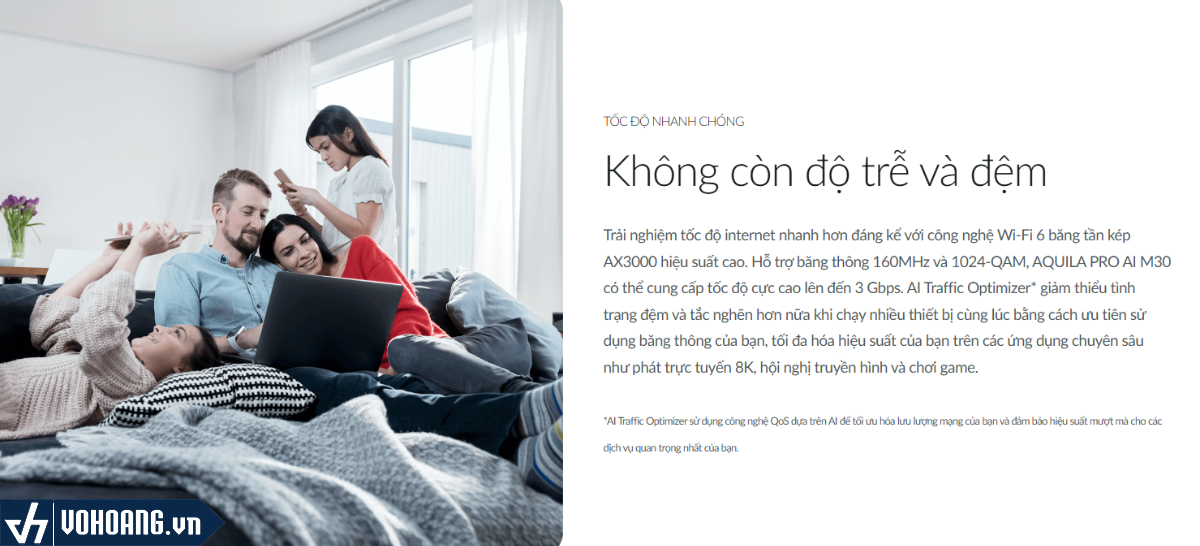 Trải nghiệm tốc độ internet nhanh hơn đáng kể với công nghệ Wi-Fi 6 băng tần kép AX3000 hiệu suất cao. Hỗ trợ băng thông 160MHz và 1024-QAM, AQUILA PRO AI M30 có thể cung cấp tốc độ cực cao lên đến 3 Gbps. AI Traffic Optimizer* giảm thiểu tình trạng đệm và tắc nghẽn hơn nữa khi chạy nhiều thiết bị cùng lúc bằng cách ưu tiên sử dụng băng thông của bạn, tối đa hóa hiệu suất của bạn trên các ứng dụng chuyên sâu như phát trực tuyến 8K, hội nghị truyền hình và chơi game.