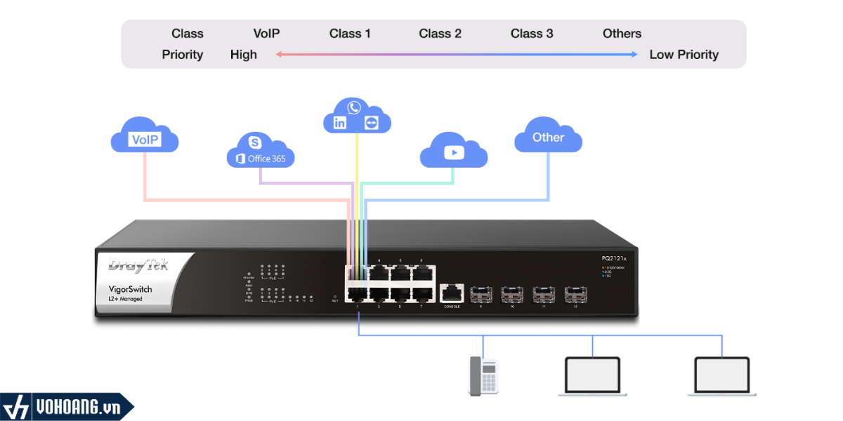 Khi lưu lượng truy cập mạng tăng cao, tính năng QoS trên VigorSwitch PQ2121x giúp cải thiện đáng kể hiệu suất bằng cách ưu tiên các truy cập quan trọng lên trước. PQ2121x cho phép phân loại lưu lượng truy cập theo chuẩn 802.1p CoS, DSCP, IP Precedence phù hợp cho việc triển khai hệ thống IP camera, IP phone đòi hỏi chất lượng cuộc gọi và hình ảnh truyền tải ổn định.