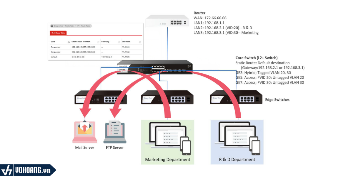 Tính năng nâng cao của Layer 3 như DHCP server/ Static Route/ VLAN router.