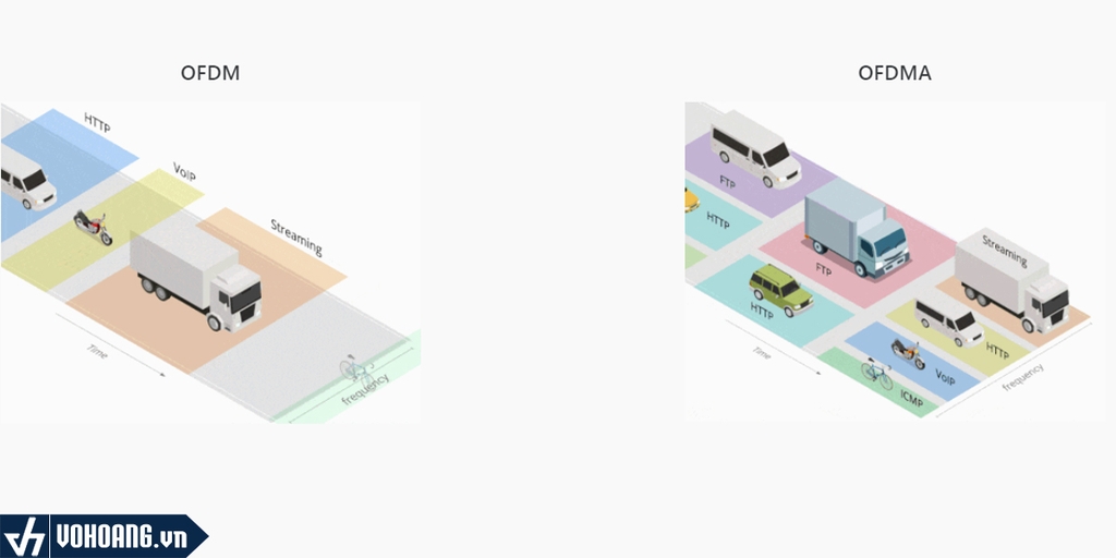 OFDMA chia một đường truyền thành các nhóm sóng mang phụ và mỗi sóng mang phụ có thể được sử dụng bởi các máy khách khác nhau. Với nhiều khách hàng truyền đồng thời trên cùng một kênh, nó sẽ cải thiện hiệu quả của mọi cơ hội truyền dẫn và do đó làm tăng trải nghiệm không dây trong môi trường mật độ cao.