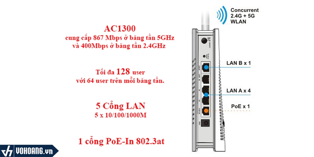 ✪ Băng tần 2.4GHz (400Mbps) và 5GHz (867Mbps). Chịu tải tối đa 100 user (2.4GHz: 40 user; 5GHz: 64 user; 2.4GHz + 5GHz: 100 user).