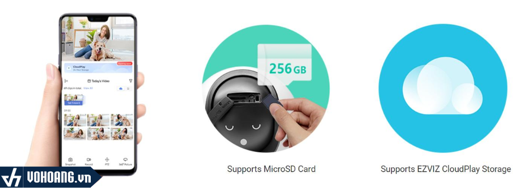 Lưu trữ những khoảnh khắc khó quên của bạn trên thẻ nhớ microSD lên đến 256GB hoặc đăng ký EZVIZ CloudPlay để có bộ nhớ đám mây được mã hóa hoàn toàn và tăng cường bảo mật.