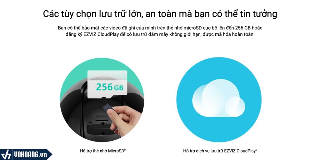 Bạn có thể bảo mật các video đã ghi của mình trên thẻ nhớ microSD cục bộ lên đến 256 GB hoặc đăng ký EZVIZ CloudPlay để có lưu trữ đám mây không giới hạn, được mã hóa hoàn toàn.