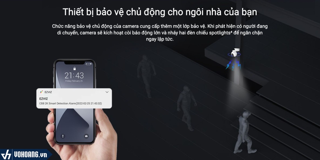 Chức năng bảo vệ chủ động của camera cung cấp thêm một lớp bảo vệ. Khi phát hiện có người đang di chuyển, camera sẽ kích hoạt còi báo động lớn và nháy hai đèn chiếu spotlights⁴ để ngăn chặn ngay lập tức.