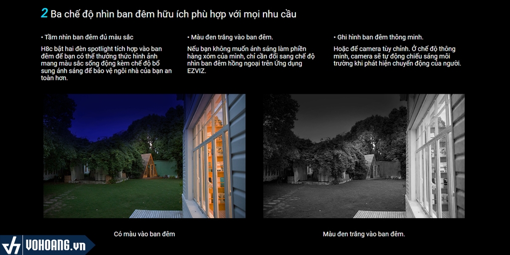 • Tầm nhìn ban đêm đủ màu sắc: H8c bật hai đèn spotlight tích hợp vào ban đêm để bạn có thể thưởng thức hình ảnh mang màu sắc sống động kèm chế độ bổ sung ánh sáng để bảo vệ ngôi nhà của bạn an toàn hơn.