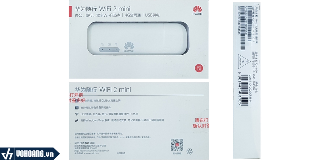 Khác với các phiên bản nhà mạng thường được đóng gói chung trong hộp đựng màu đỏ, Huawei E8372h-820 được đóng gói gọn gàng, chắc chắn trong hộp từ nhà sản xuất với thông tin rõ ràng trùng khớp giữa hộp và sản phẩm.