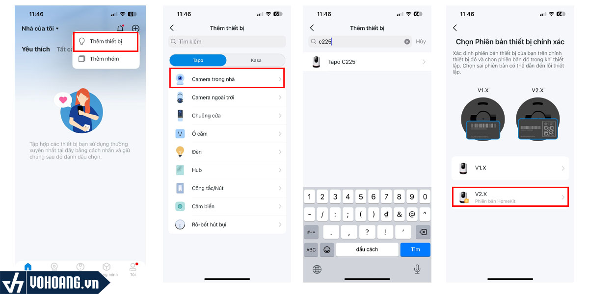 Làm theo hướng dẫn như hình bên dưới để thêm thông tin cấu hình cho camera bao gồm thêm thiết bị, lựa chọn sản phẩm cần thêm, chọn Camera Tp-Link Tapo C225 cần thêm và chọn phiên bản cần thêm.