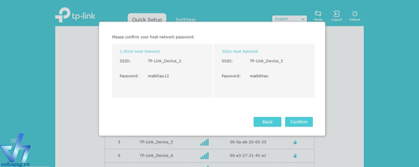 Bước 8: Sau khi lựa chọn 2 sóng wifi 2.4Ghz và 5.0Ghz và nhập mật khẩu thiết bị sẽ thể hiện thông tin cho chúng ta kiểm tra lại ![]()