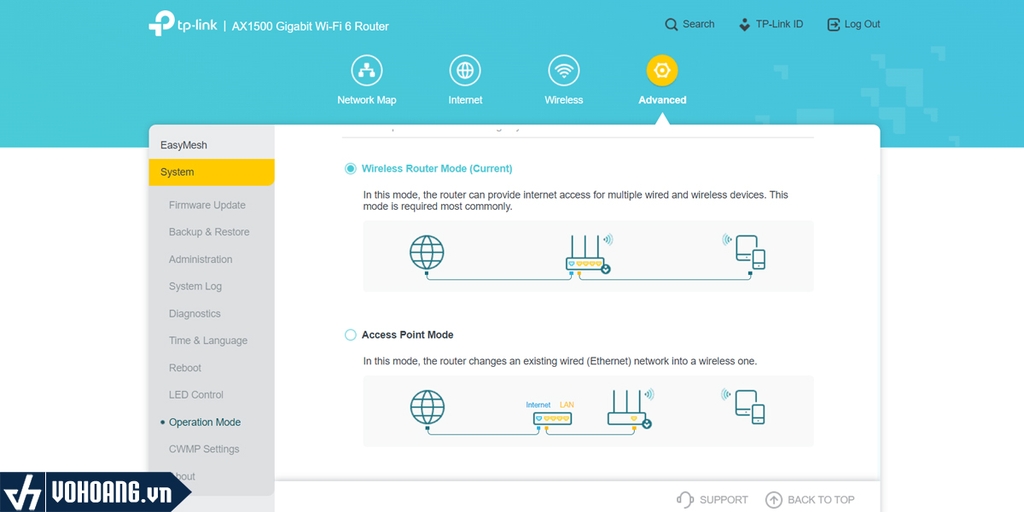 - Đổi mode (chế độ hoạt động): Ngoài chế độ làm Wireless Router bạn có thể tùy chọn qua chế độ Access Point (điểm truy cập) trong trường hợp cần thiết